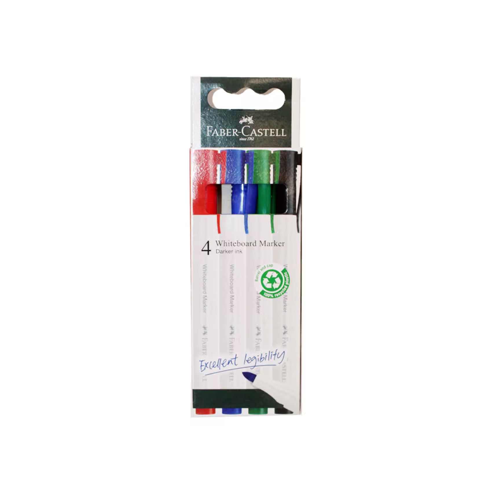 Buy the Faber-Castell Whiteboard Markers (Pack of 4) at Metrix Books Store Qatar. This set includes red, blue, green, and black markers with a fine bullet nib for precise writing on any dry-erase surface. The low-odor, intense, quick-drying ink wipes clean without residue and offers excellent visibility.